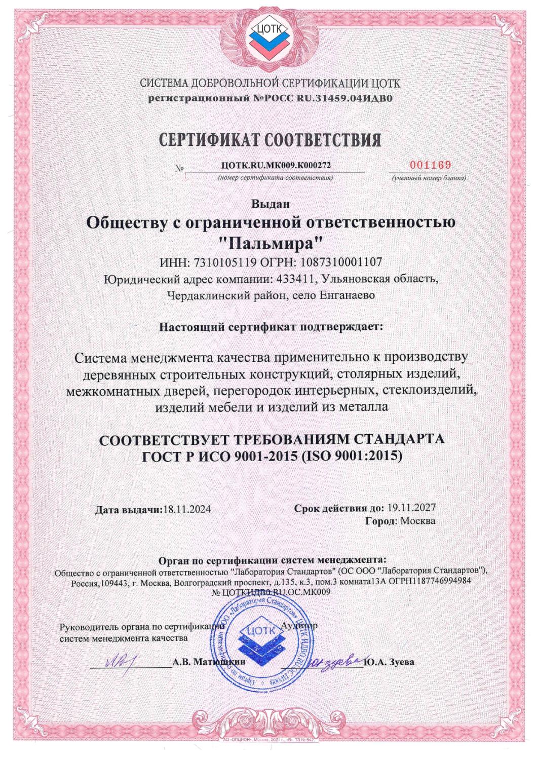 Сертификат соответствия №001169