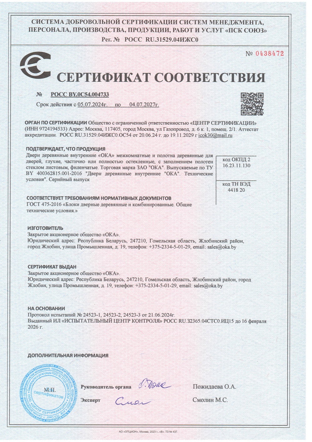 Сертификат соответствия №0438472