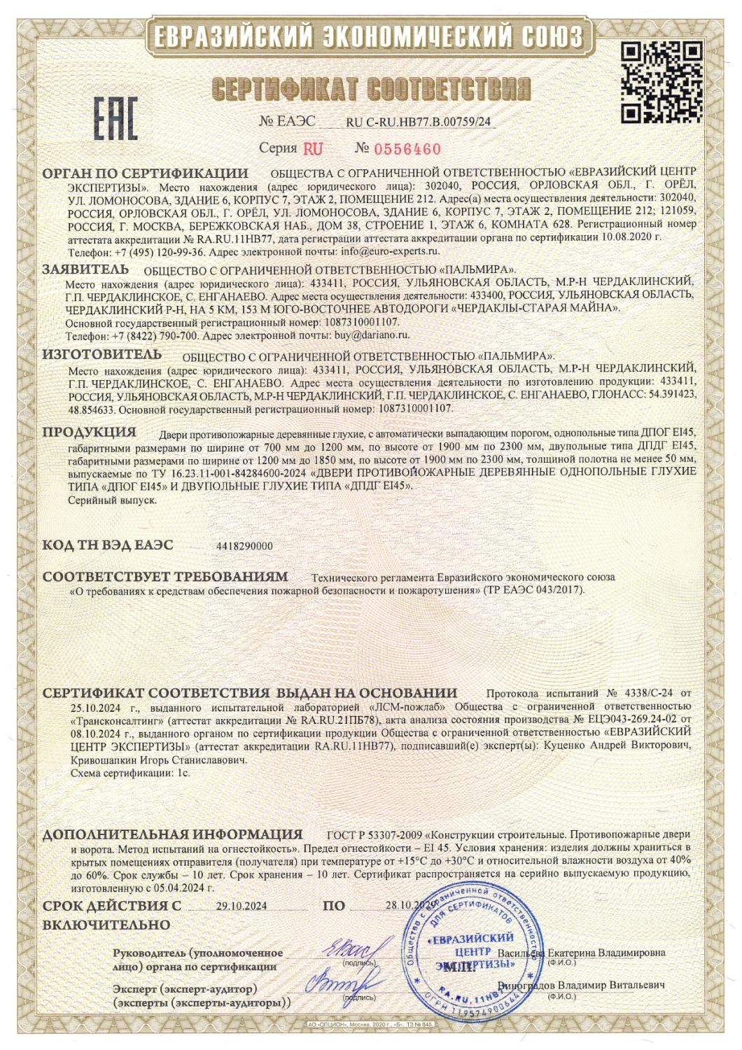 Сертификат соответствия №0556460