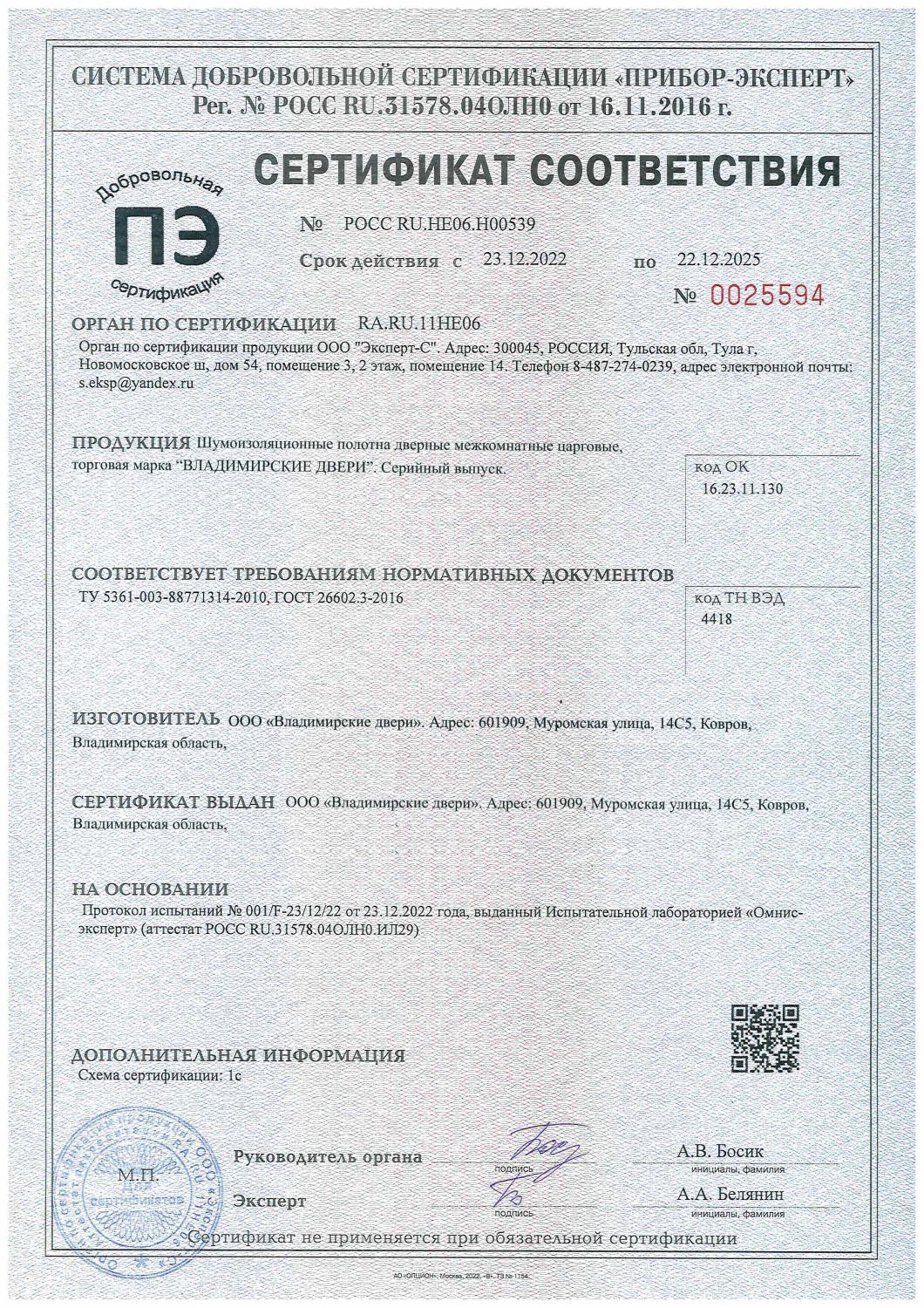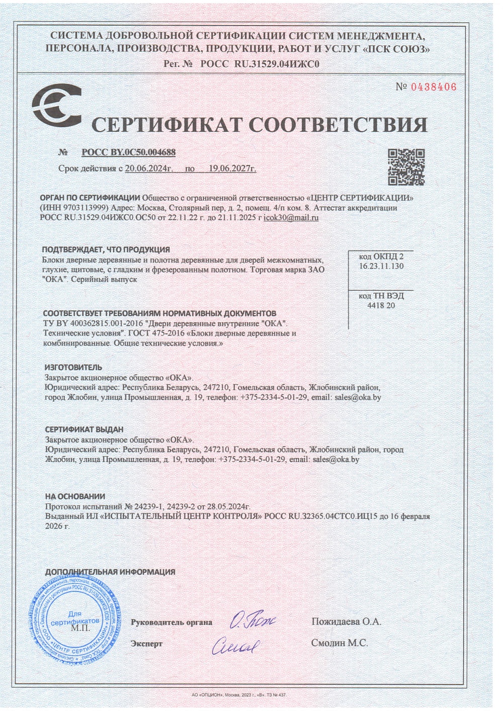 Сертификат соответствия №0438406