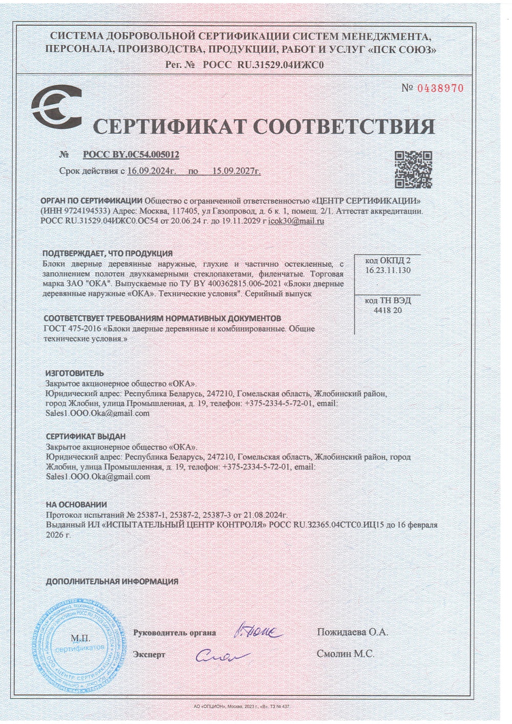 Сертификат соответствия №0438970